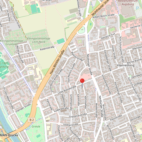 Die Hegelstraße liegt im Augsburger Stadtteil Lechhausen und überzeugt durch ihre ruhige, verkehrsberuhigte Wohnlage bei gleichzeitig guter Erreichbarkeit der Innenstadt. Die Lechanlage verläuft nur rund 300 Meter entfernt und bietet ein attraktives grünes Naherholungsgebiet direkt vor der Haustür.