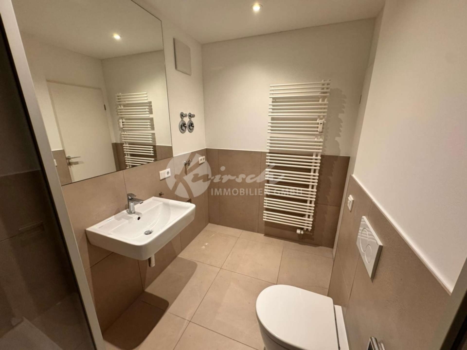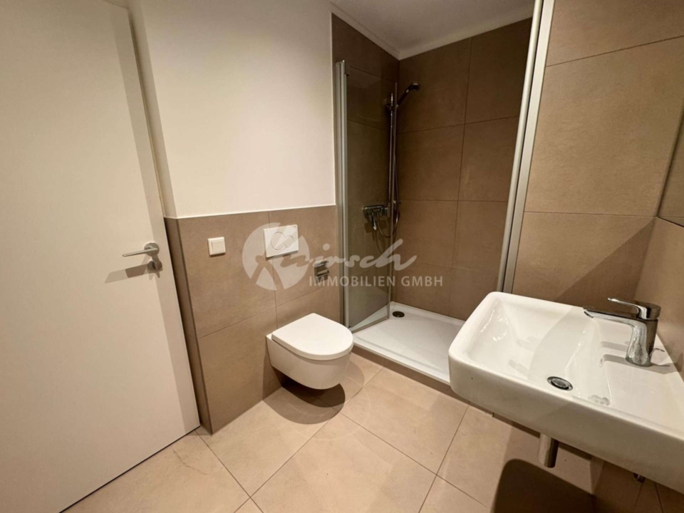 Das Bad präsentiert sich als echtes Highlight: eine bodengleiche, begehbare Dusche, großformatige Fliesen und hochwertige Armaturen schaffen eine luxuriöse Wohlfühlatmosphäre.
