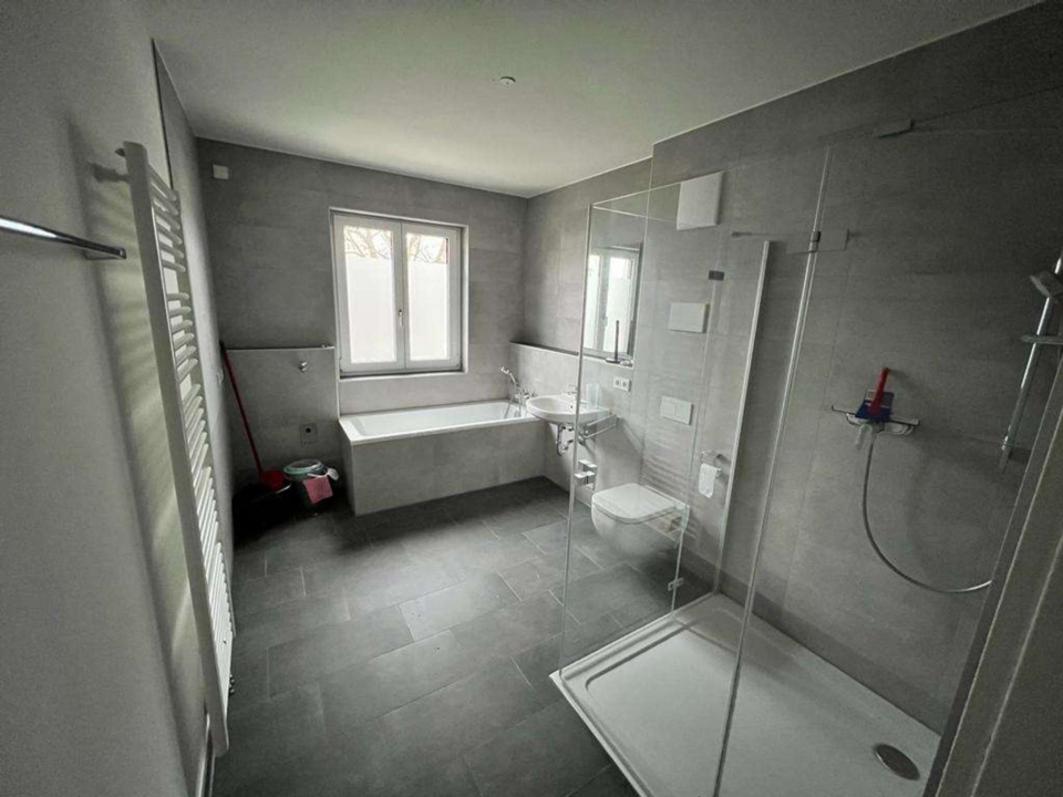 - Modernes Badezimmer mit bodentiefer Dusche, Badewanne und Waschmaschinenanschluss