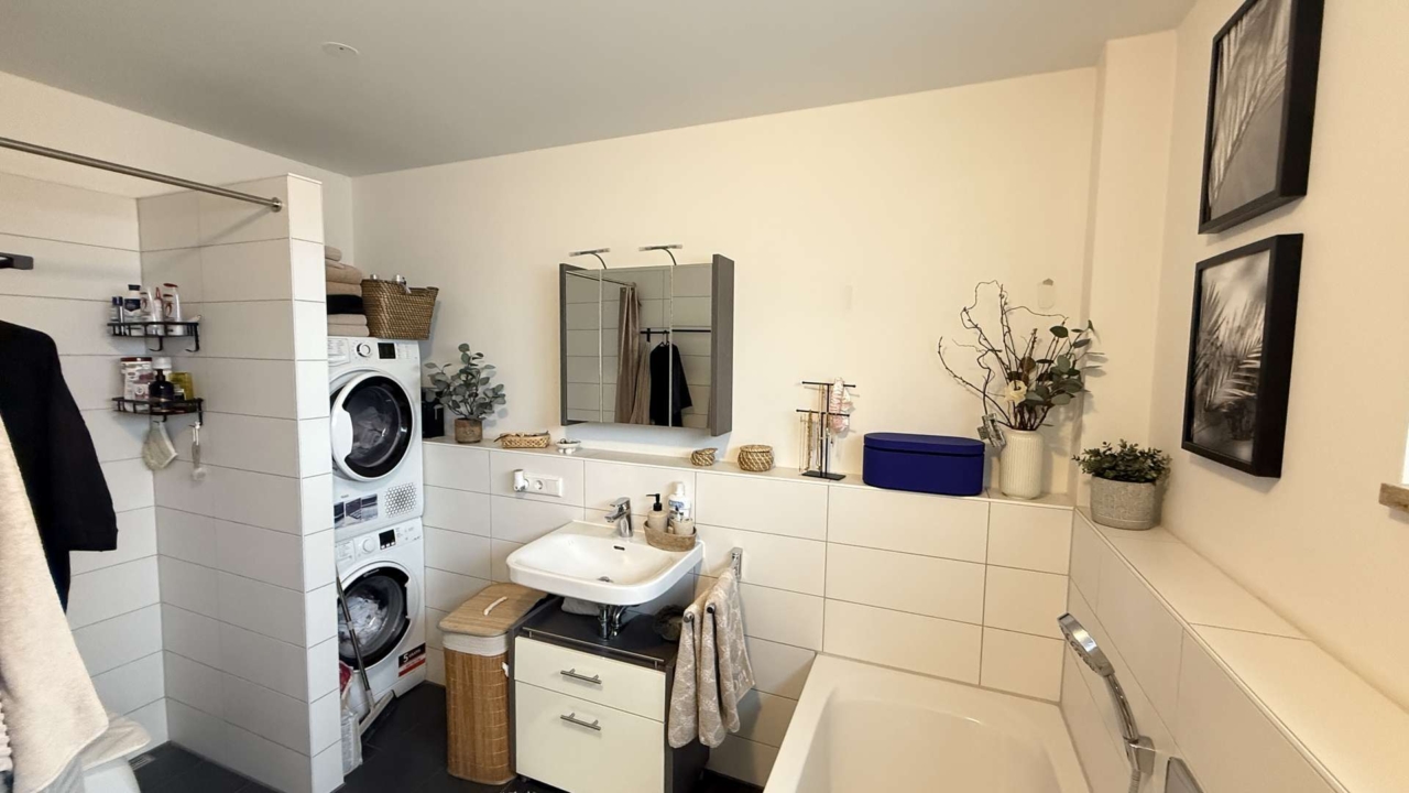 • Heller, modern gefliestes Badezimmer mit Badewanne, separater Dusche und Waschmaschinenanschluss